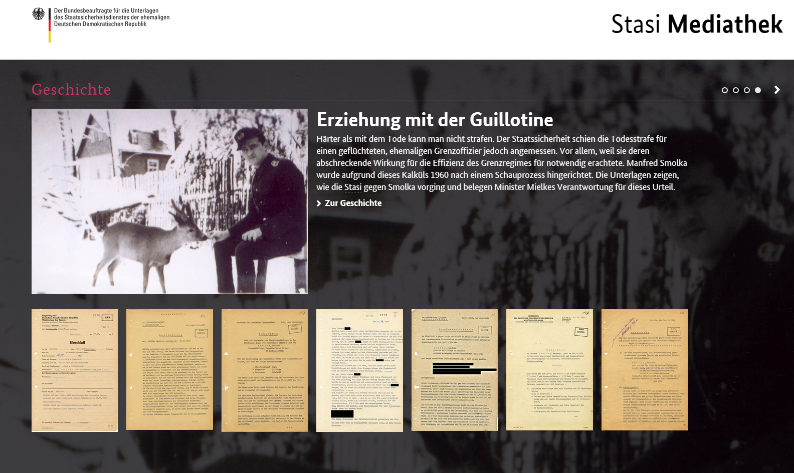 Doté d'une remarquable interface, ce site est un modèle de valorisation documentaire : navigation intuitive, enrichissement du document original par une transcription, glossaire dédiée aux acronymes, zoom... Outre les documents textuels, Stasi Mediathek propose également une quinzaine d'heures de vidéo et environ six heures d'enregistrements sonores.