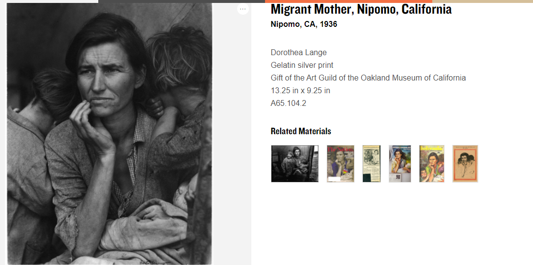 Cette icône de la photographie documentaire figure parmi les milliers de documents mis gratuitement à disposition des internautes par le Musée d'Oakland (Californie). Dorothea Lange (1895-1965) avait confié à l'institution un impressionnant corpus documentaire composé de 40 000 négatifs et de plus de 6 000 tirages d'époque ainsi que des carnets de notes.