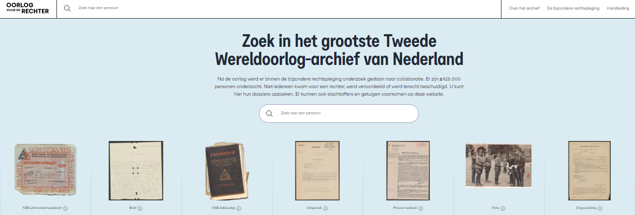 Le 2 janvier 2025, les Archives nationales néerlandaises ont lancé la plateforme en ligne « Oorlog voor de Rechter » (« La guerre devant le juge »), qui permet d'accéder à une partie des dossiers judiciaires et policiers de 425 000 Néerlandais accusés ou suspectés de collaboration avec l'occupant nazi pendant la Seconde Guerre mondiale. Ce projet, financé par trois ministères néerlandais, suscite déjà une vive controverse, notamment en raison de la sensibilité des données dévoilées et des risques pour la vie privée des descendants.