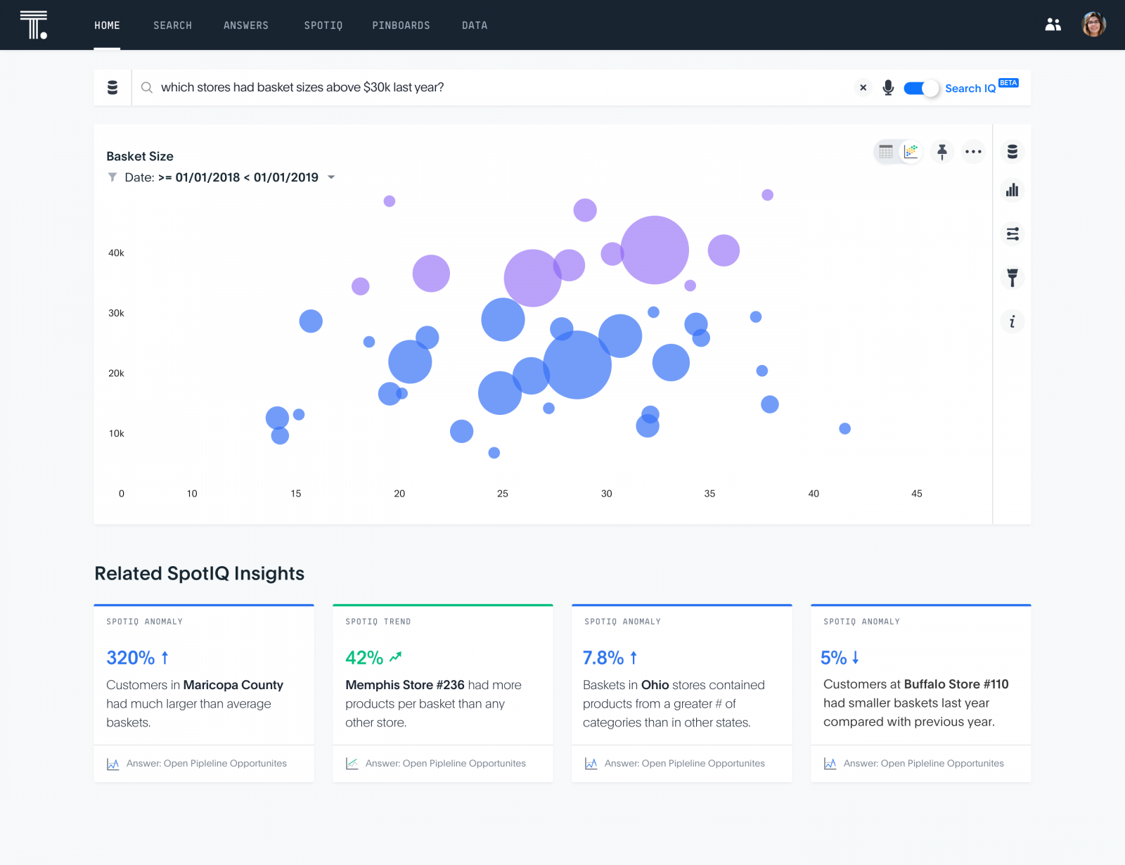 Mieux encore, la dimension IA de ThoughtSpot permet à la solution de proposer aux utilisateurs des réponses à des questions qu’ils ne se seraient encore jamais posées. À travers l’analyse constante des données, la solution est en effet capable d’identifier des tendances au sein des ensembles de données de l’entreprise et d’en alerter les utilisateurs.