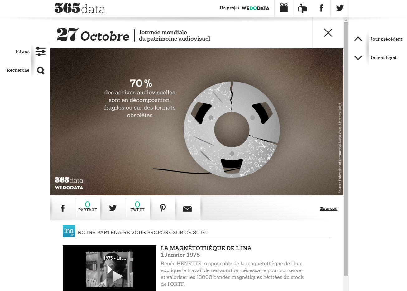 Ces données proviennent de documents indigestes que personne ne lit pertinents mais difficilement accessibles. L'agence WeDoData a donc décidé de les présenter sous une forme graphique attractive via son projet 365 Data. Chaque jour, un nouveau jeu de données est proposé aux internautes : politique, santé, transports, sport, vie quotidienne... Sobre et élégante, la visualisation est accompagnée d'un court texte qui va droit à l'essentiel. Le tout se déguste en quelques secondes.