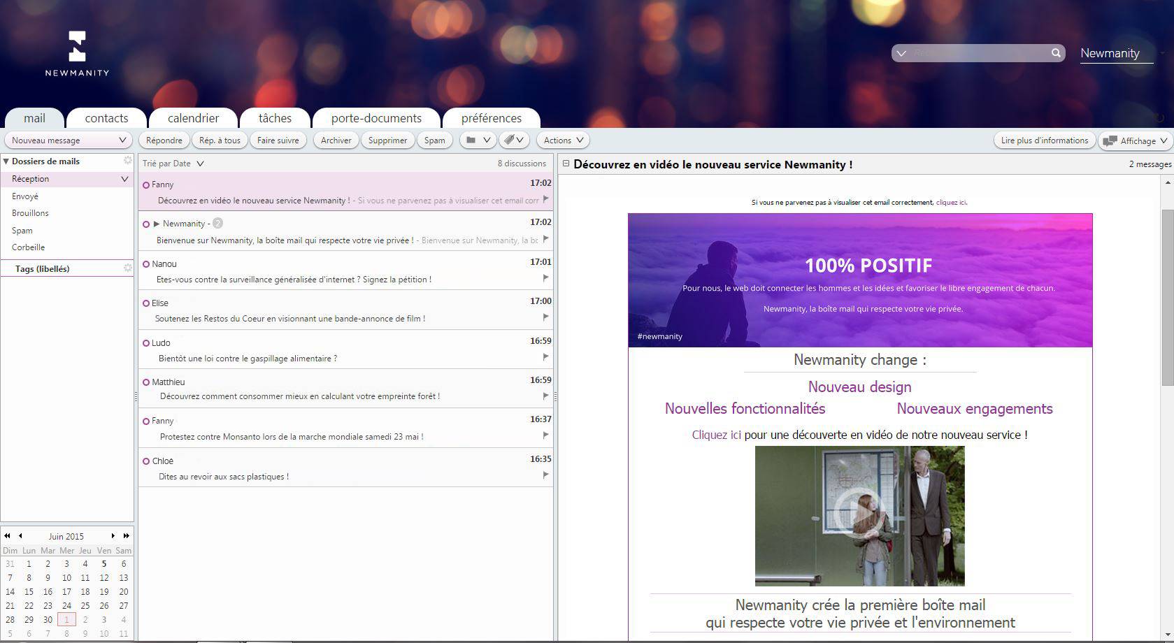 Les nouveaux utilisateurs de Newmanity pourront importer leurs contacts, les courriels et leur agenda existants sur d'autres messageries. Un système d'onglets permet d'accéder aux différentes fonctionnalités : contacts, calendrier, tâches, porte-documents...